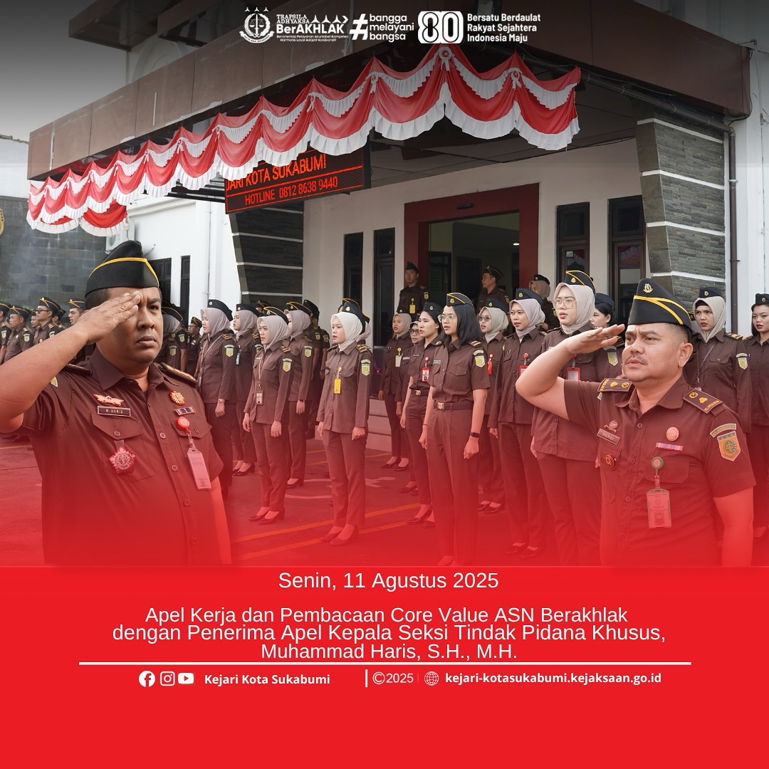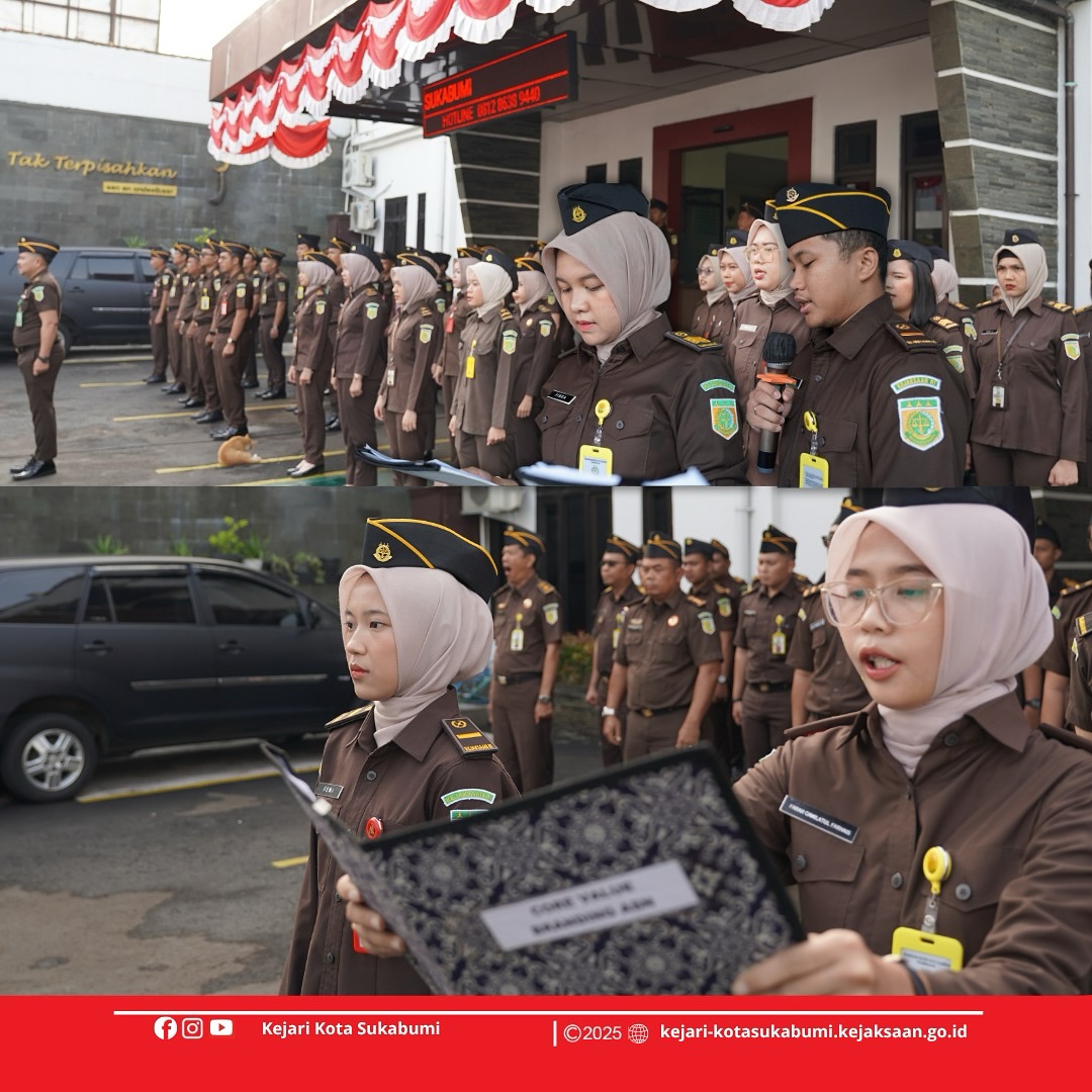 Kejaksaan Negeri Kota Sukabumi Melaksanakan Kegiatan Apel Kerja dan Pembacaan Core Value ASN Berakhlak dengan penerima apel Kepala Seksi Tindak Pidana Khusus, Muhammad Haris, S.H.,M.H. Bertempat di Halaman Kantor Kejari Kota Sukabumi diikuti oleh seluruh pegawai.