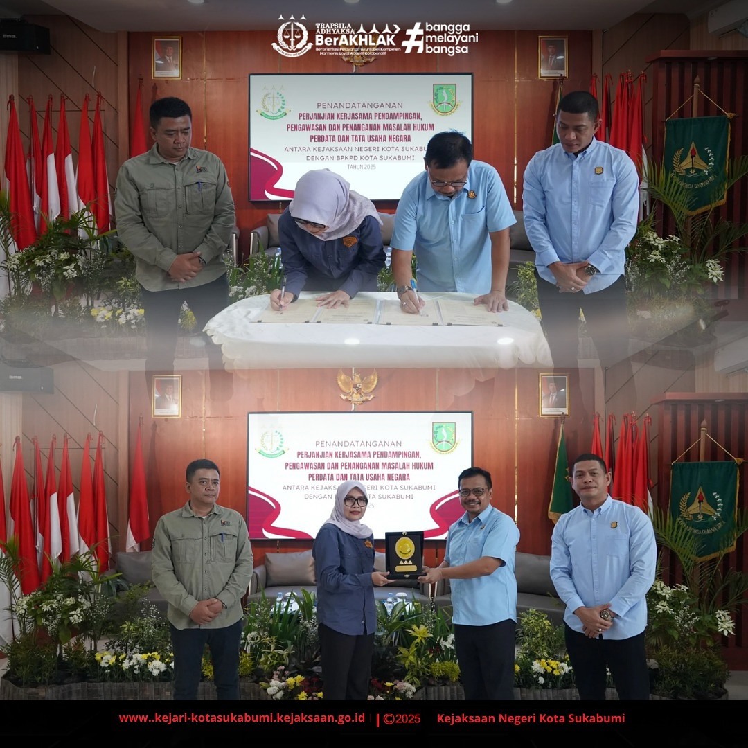Bertempat di Aula Kejaksaan Negeri Kota Sukabumi, telah dilaksanakan kegiatan Penandatanganan Nota Kesepahaman (MoU) tentang Penanganan Masalah Hukum di Bidang Perdata dan Tata Usaha Negara antara Badan Pengelolaan Keuangan dan Pendapatan Daerah (BPKPD) Kota Sukabumi dengan Kejaksaan Negeri Kota Sukabumi.